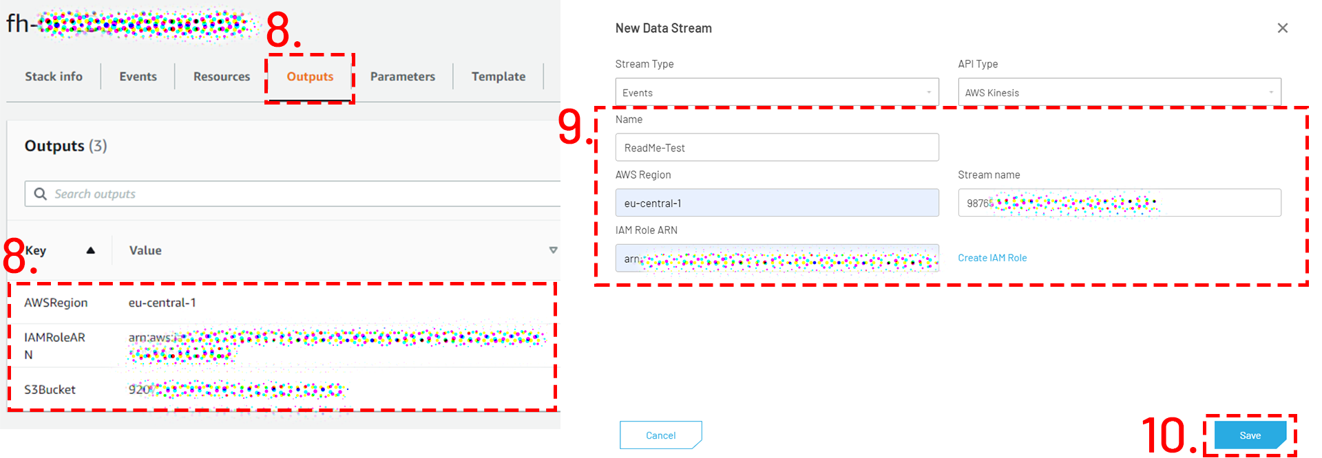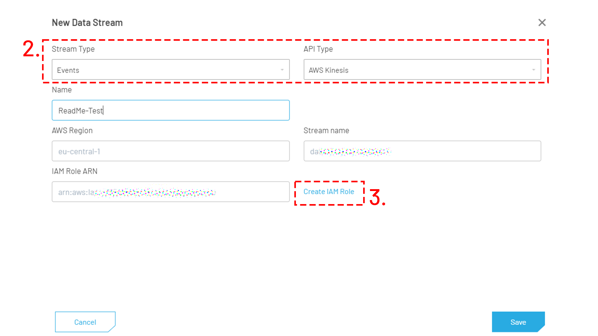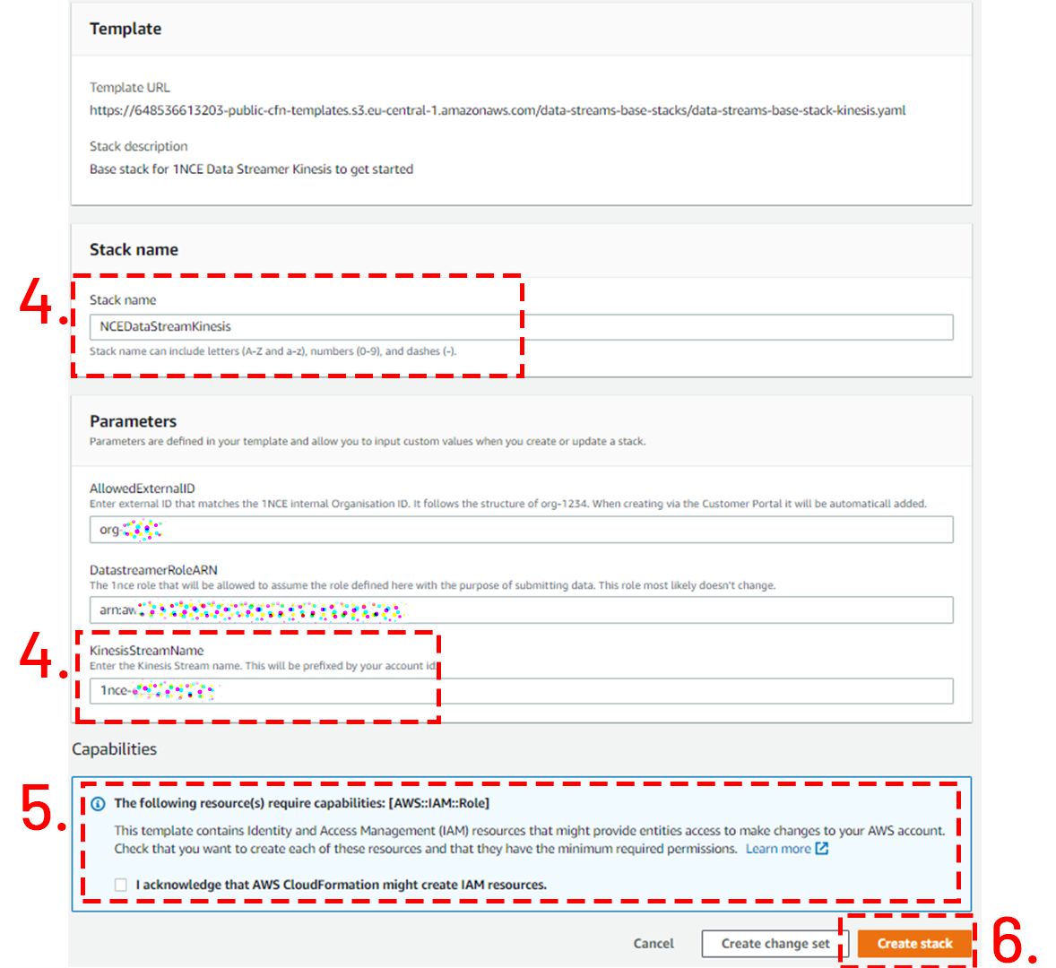 1. Adapt the CFN Template parameters (Stack Name, KinesisStreamName). Do NOT change AllowedExternalID and DatastreamerRoleARN.