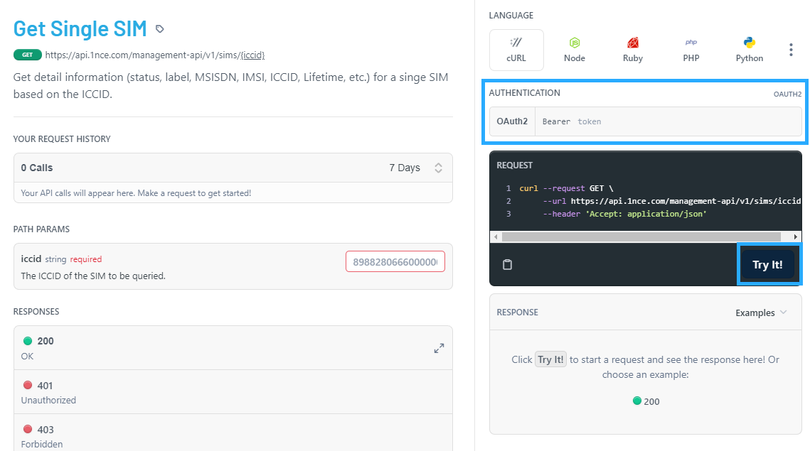 To give the API Explorer a try and to complete the code samples, insert the Access Bearer Token obtained from the Create Access Token API call in the OAuth2 Auth Bearer field. Afterwards, any API requests in the API Explorer as well as the code samples can be used to try the functionality.